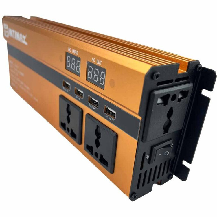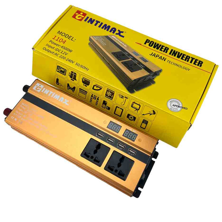 مبدل برق خودرو اینتیمکس مدل 1104 با توان 4500 وات یه دستگاه قوی که برق باتری 12 ولت ماشین را به برق شهری 220 ولت تبدیل می کند سه تا پریز برق و چهار تا پورت یو اس پی دارد با آمپرهای متافاوت ، پس می توانیم تمامی وسایل برقی که توان خروجی آن زیر4500 وات باشد و با سیستم شبه سینوسی فعالیت میکنند را به آن متصل کرد،